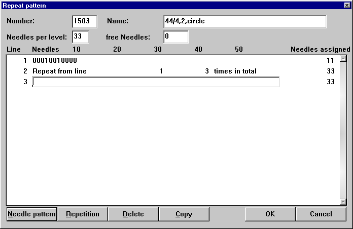 A repeat pattern consists of its name, a number, the number of needles per level and one or more data sets. The needles which are still free are also displayed.