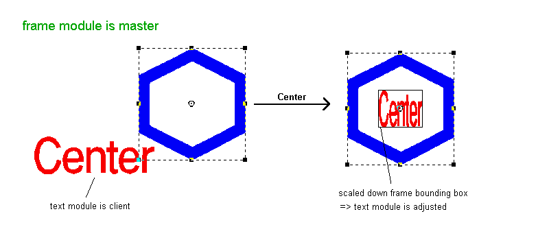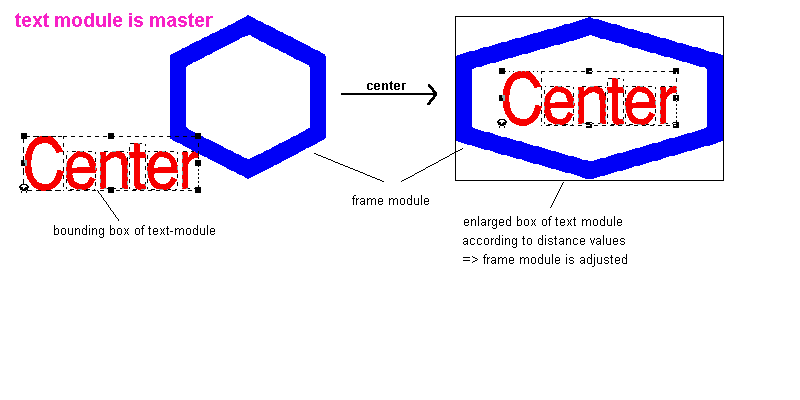 Example 1 : The text module is the master module and remains unchanged in size, while the frame module (client) is adjusted. Because the text module has a lower priority compared to the frame module, the distance values are added to the bounding box of the text module and the resulting box is the box the frame is adjusted to.