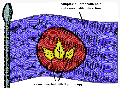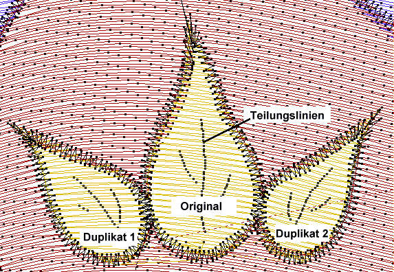 The program contains a very efficient algorithm to calculate complex fill areasNPC9PO (tatami stitch areas) with holes34_TZI.. Further on, these areas can be modified with a variety of options as there are :