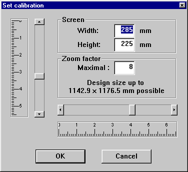 This function is used to adjust the display so that size of 1 cm as displayed on the rulers actually corresponds to 1 cm. To do this you can either input in mm the size of your screen, or shift the scrollbars present on the rulers until the distance between two marks is actually 1 cm. The picture displayed on the screen (in zoom factor 1) then represents the actual size of the embroidery. The measurements shown on the rulers are always correct, this means that when a design is shown on the rulers displayed to be 10 cm high, then it will actually be this size irrespective of its size on the screen.